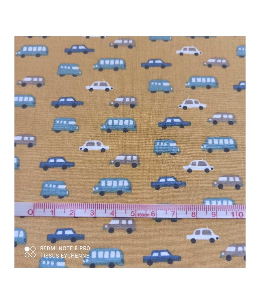 Tissu cretonne - voiture bus ourson - beige moutarde