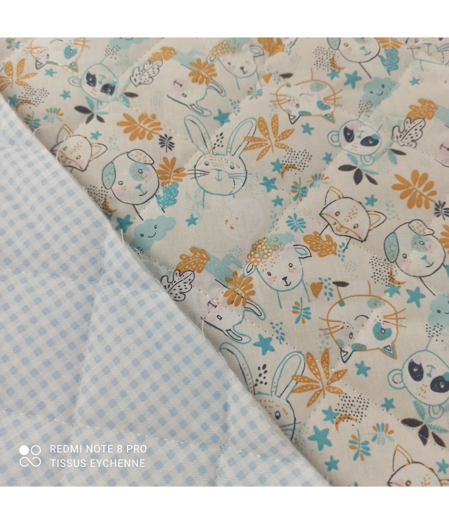 Une face coton carreaux vichy turquoise/blanc et l'autre face chat-lapin-mouton.