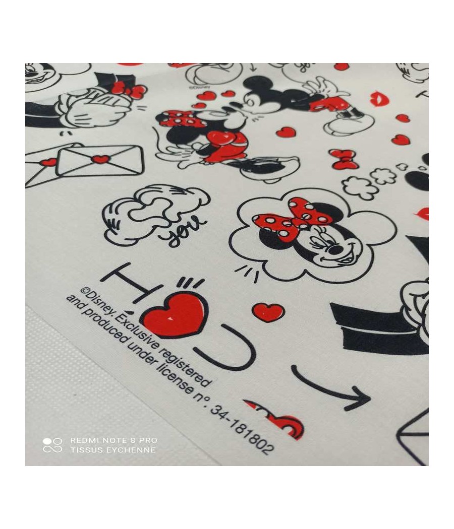 Tissu coton licence Disney Mickey I LOVE YOU Minnie. Joli symbole d'amour pour votre prochaine création dans ce motif.